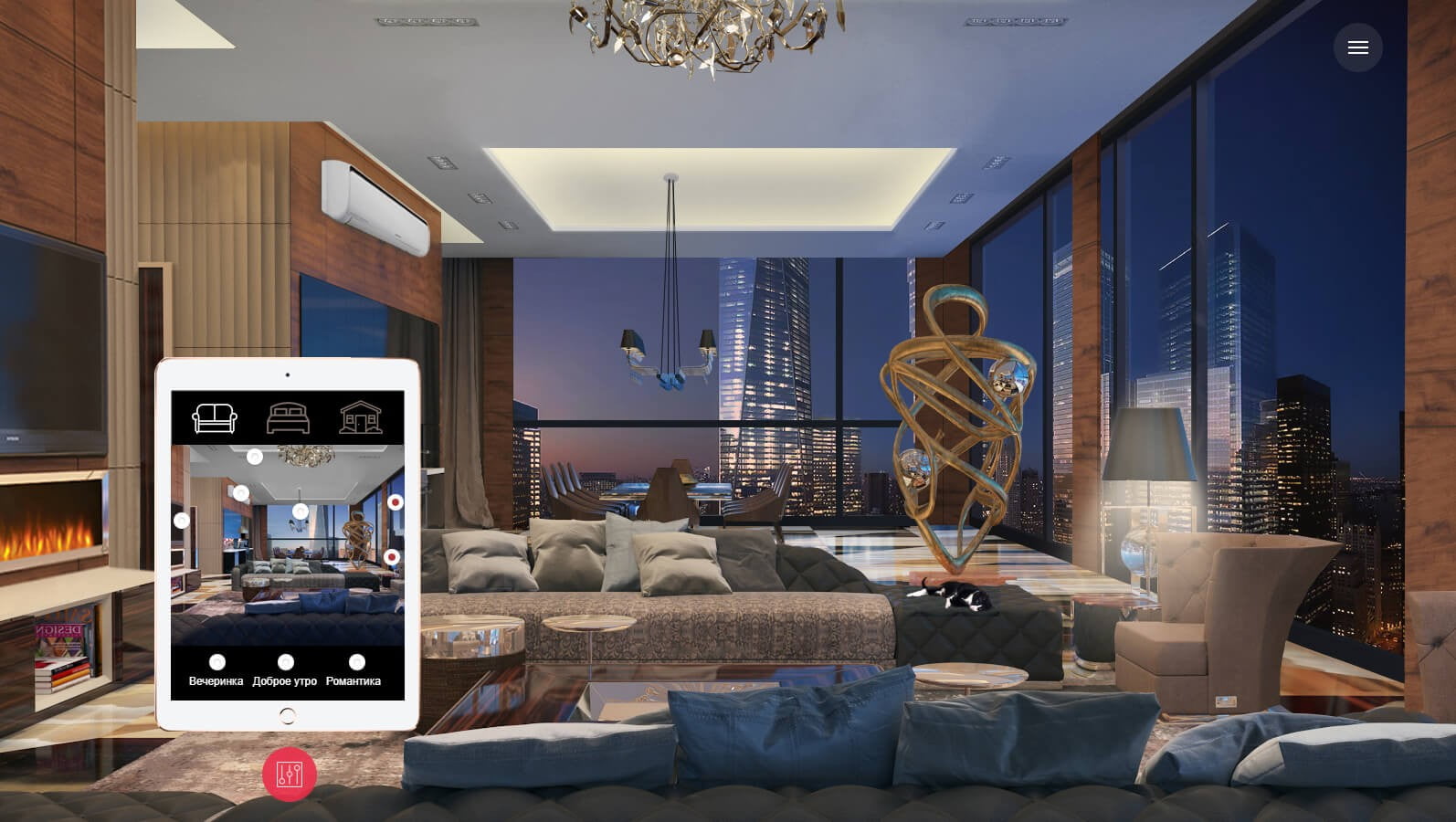 2 интерьера (холл и спальня) и экстерьер, где возможно включить светильник, установить температуру кондиционера, установить уровень освещенности основного света, погладить кошку, посмотреть телевизор, включить бра, закрыть шторы, отрыть гараж, включить свет на улице, полить придомовую территорию.