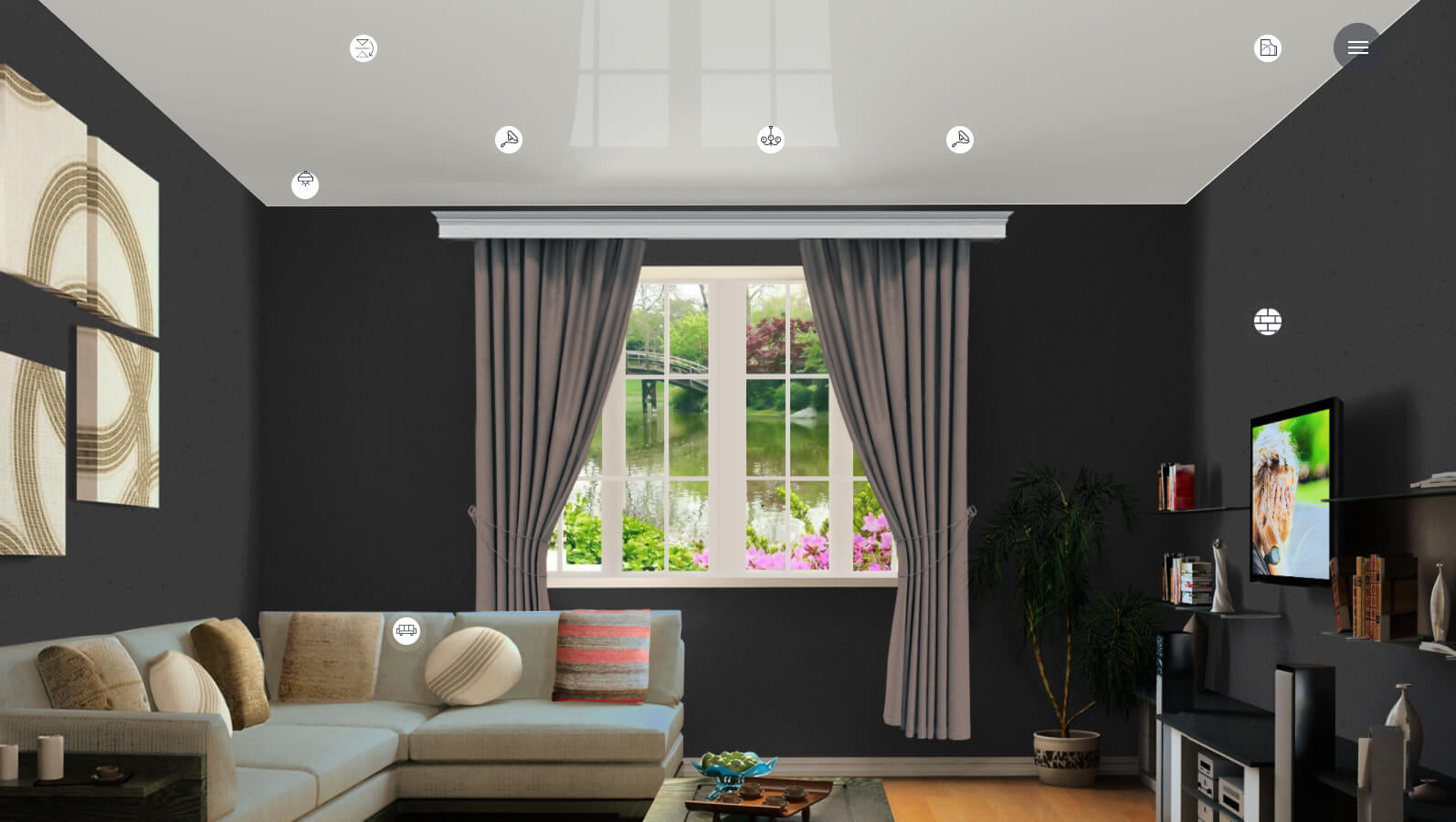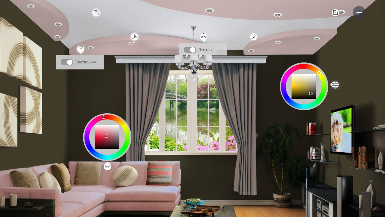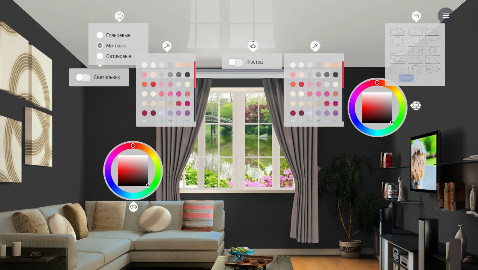 Где можно выбрать Па́ттерн / рисунок, закрасить первый и второй уровни потолка, повесить люстру, интегрировать точечные светильники, покрасить стены, покрасить в тон диван, определиться с выбором поверхности (будет ли это глянец, сатиновая или матовая).
