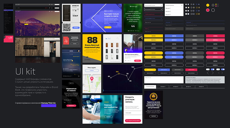 Содержит 440 блоков и элементов. Также, мы разработали Гайдлайн и Brand Book, что позволило упростить взаимодействие и привести к единообразию.