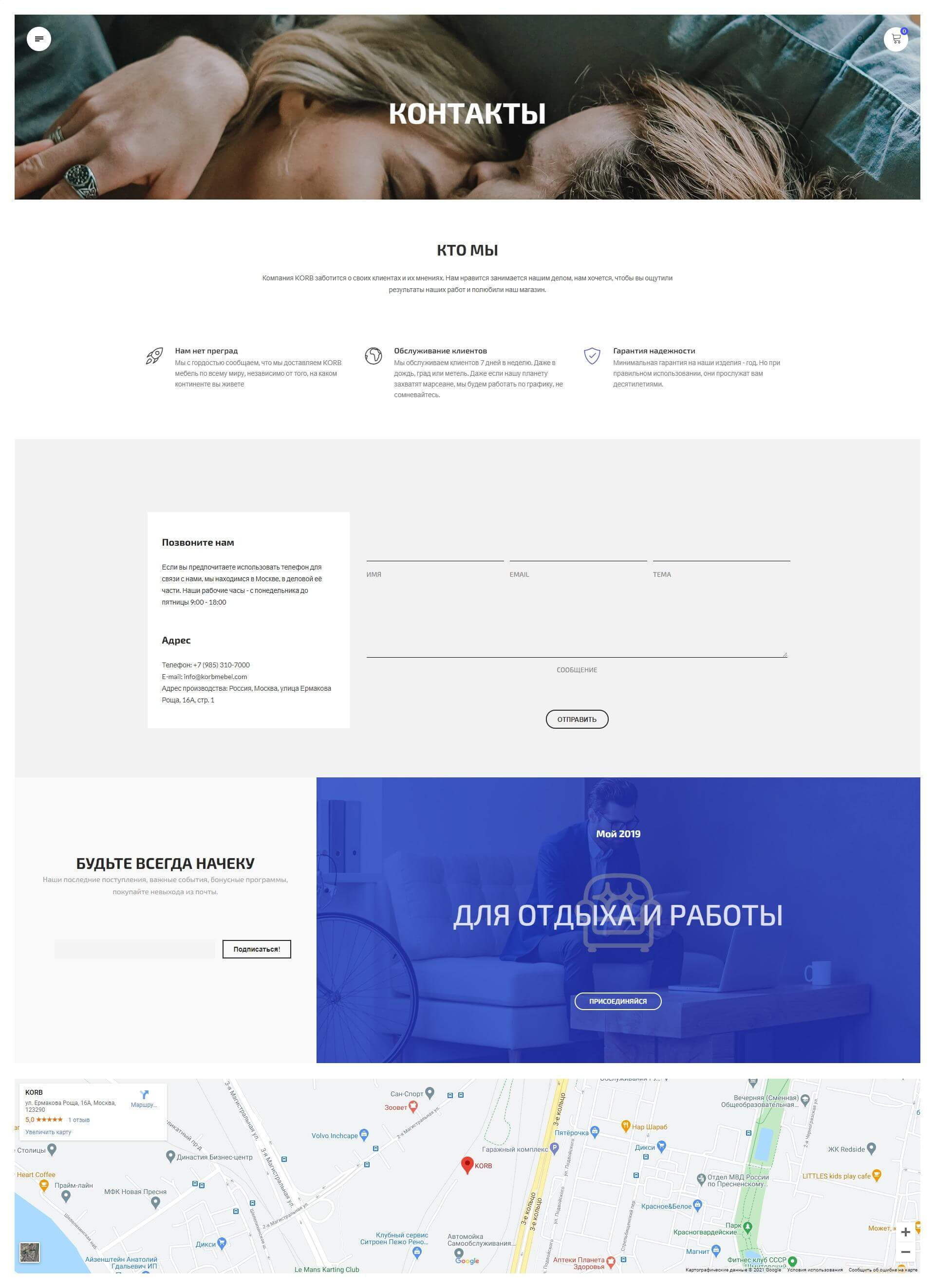 Мы делали ставку на эмоции, нежное отношение к клиентам (на странице «Контакты» на фото парень нежно обнимает девушку – это концепция взаимоотношений с ЦА).